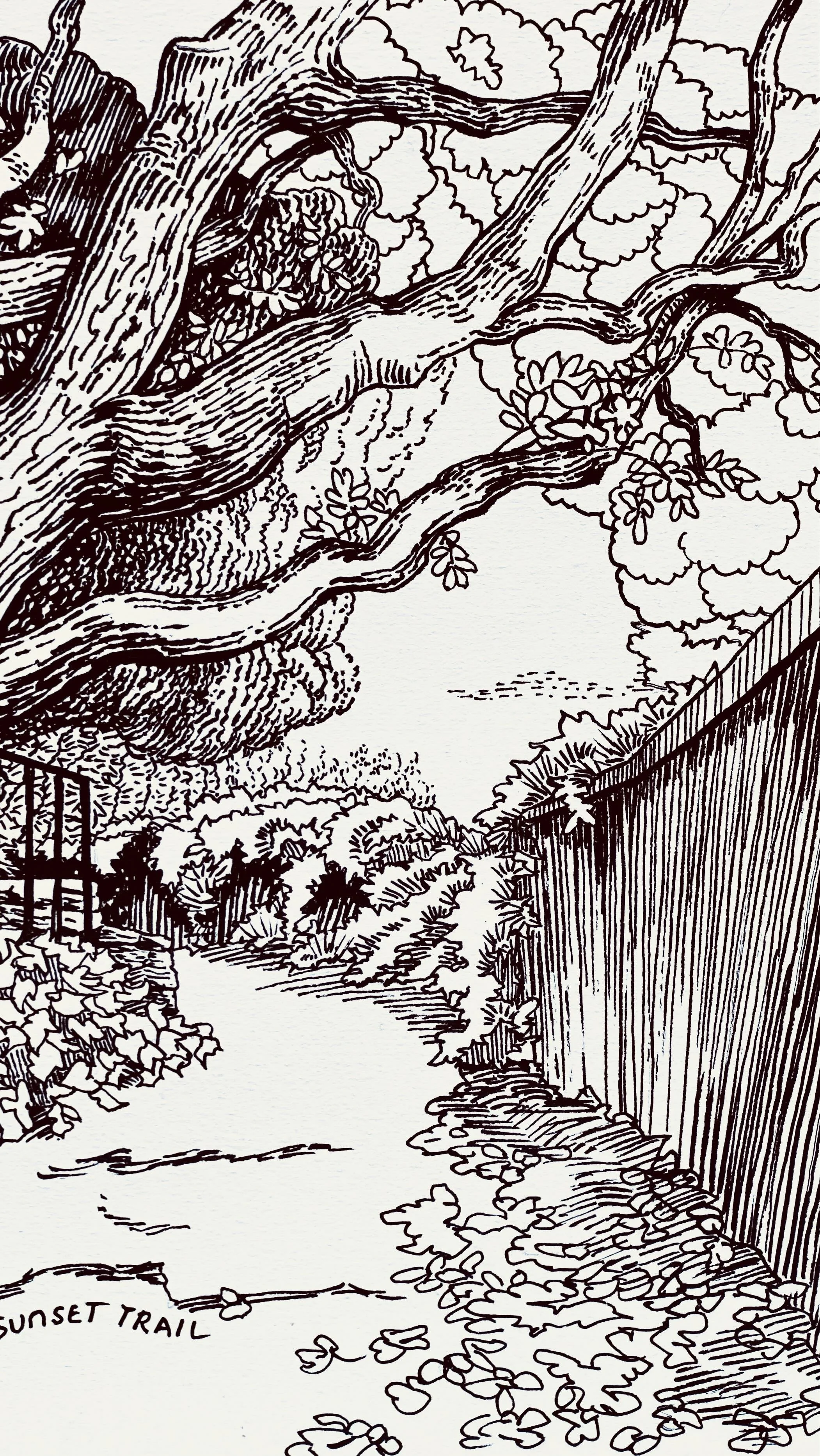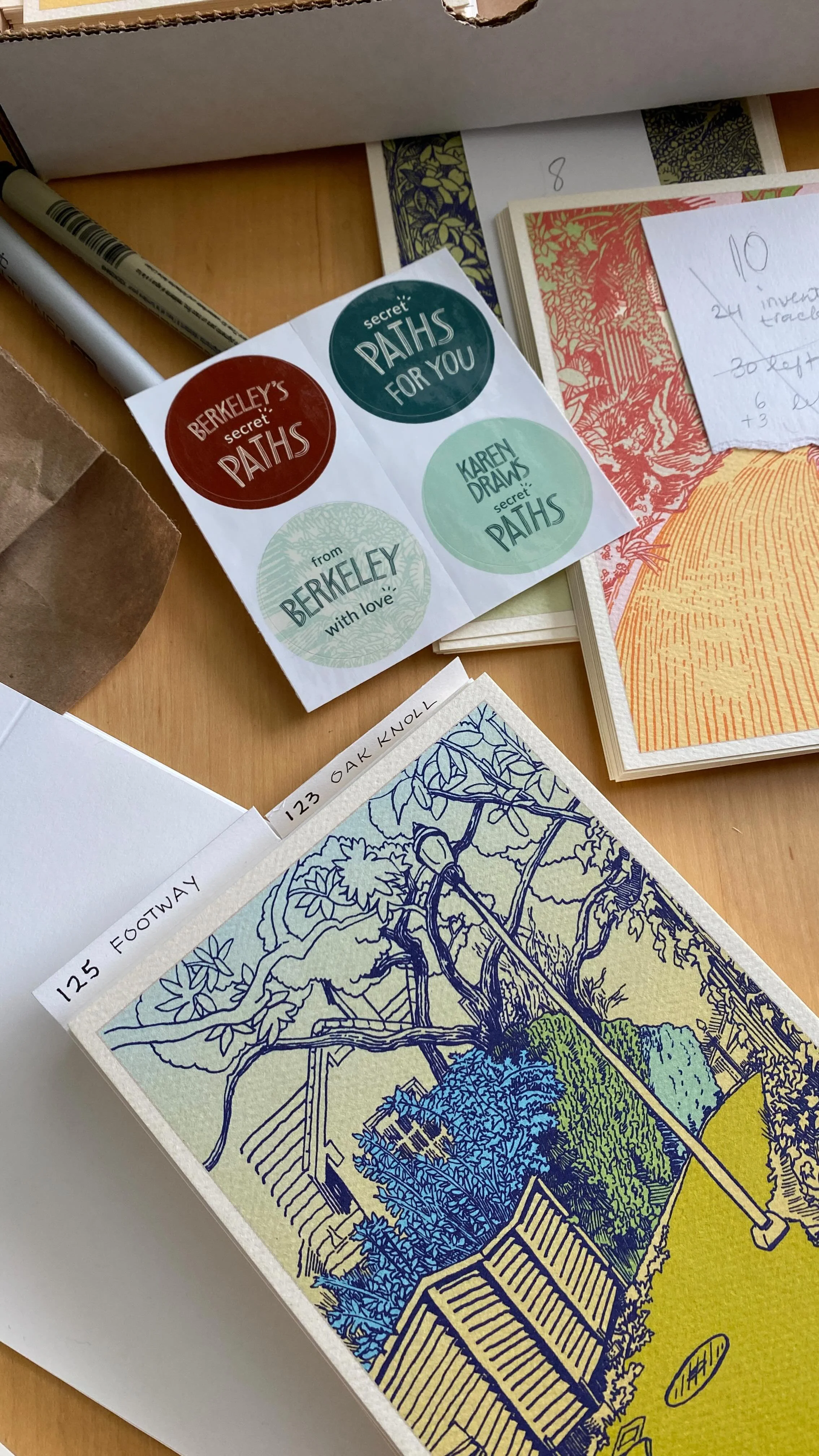 These twelve postcards illustrate the beauty and magic of Berkeley paths in the Claremont and Elmwood neighborhoods. I launched this first collection in summer, 2025. And there’s more to come. I’m drawing all 140 paths!