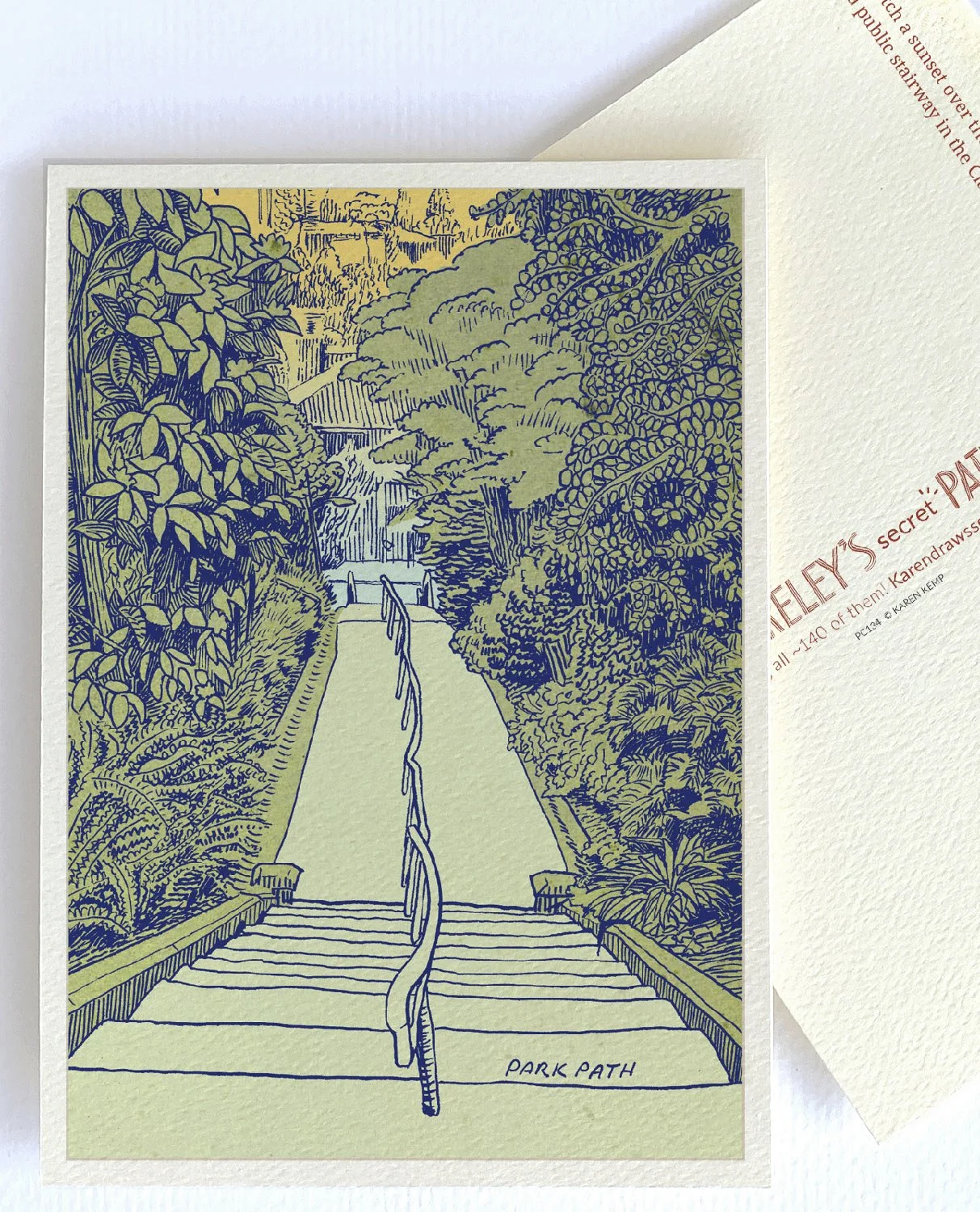 The view’s so good it practically writes your postcard for you. In this charming ink drawing Park Path looks out over the San Francisco Bay like it owns the place. Send it as a “let’s escape” note, or frame it and escape every time you look up.
